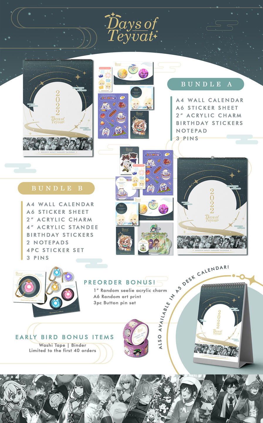 A fan-made calendar and merchandise project featuring different characters from Genshin impact, in collaboration with 14 talented Filipino artists. Final calendar bundles will be revealed soon.